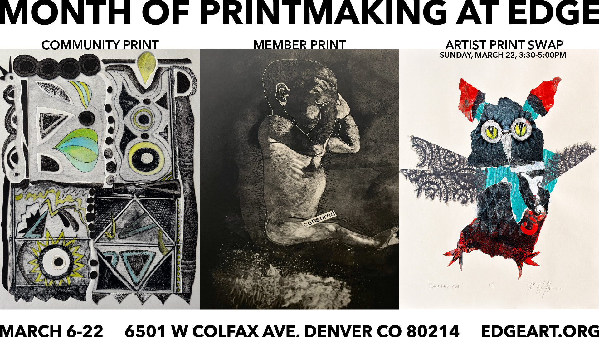 Our biennial Community Print Show features artwork made from traditional and experimental printmaking processes. Edge Gallery aims to provide a platform for all printmakers of the Denver Metro Area – both professional and emerging artists – to display their work in participation with Month of Printmaking 2026. We encourage concepts or processes that push the boundaries of expression and creativity, including unconventional approaches, alterations, or assemblages.